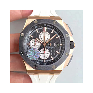 Size: 44 mm Movement: SWISS Audemars Piguet 3126 Automatic Movement 28800bph, SECONDS Running at 12@ Functions: Hours, Minutes, Seconds, Date and Chronograph with SECONDS Running at 12@ Like Genuine Case: 18K Rose Gold Dial: Black Dial Bezel: Black Ceramic Bezel Crystal: Scratch-proof sapphire crystal with AR coating Strap: White Rubber Strap Clasp: Buckle Water resistance: 50 Meters